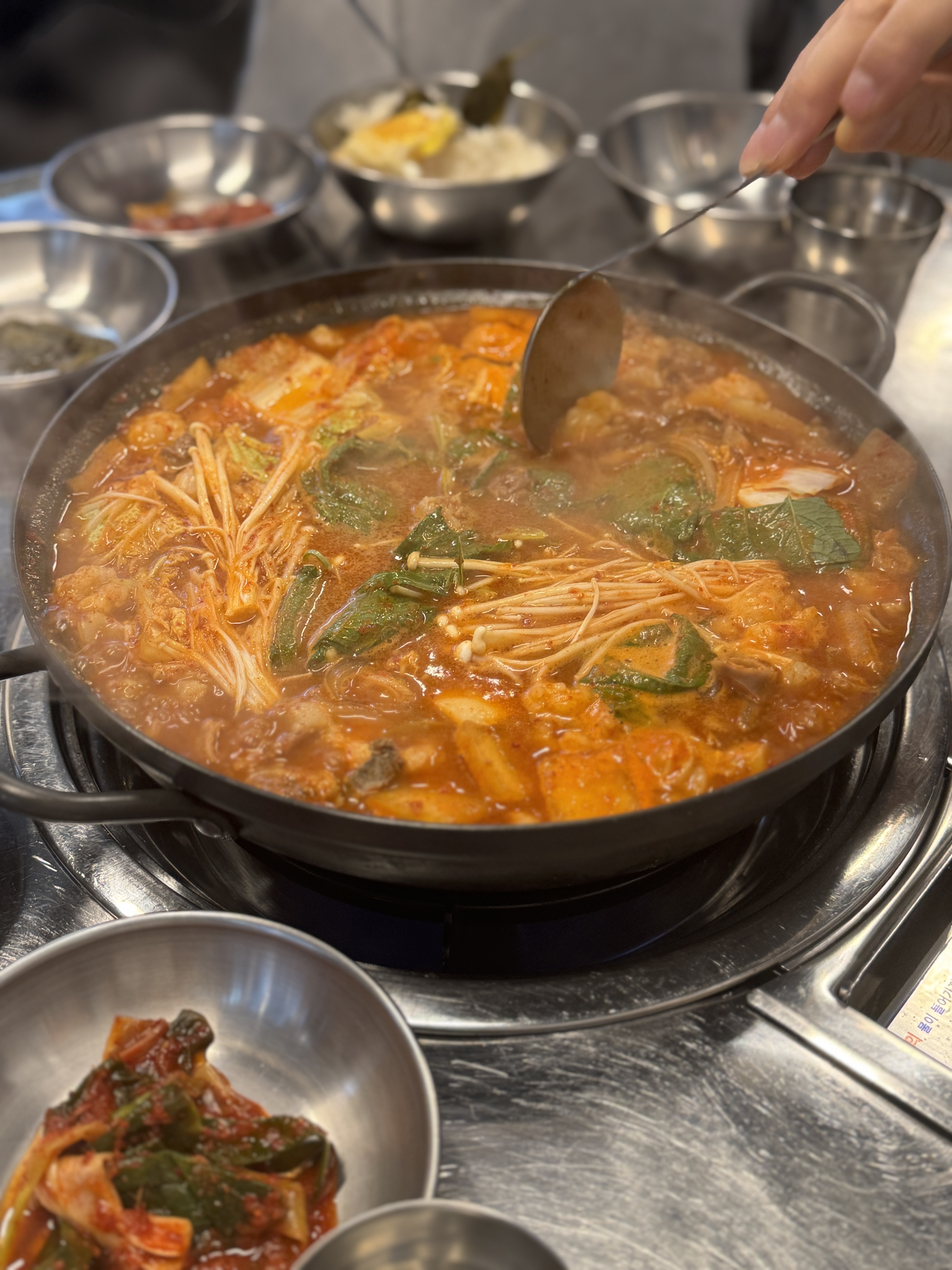 기본 반찬은 김치, 양파장아찌, 고추무침, 소시지볶음, 달걀프라이, 깻잎절임이 나온다. 특히 달걀프라이는 전골의 칼칼한 맛을 부드럽게 잡아주는데, 우리는 계란후라이도 리필해서 더 든든하게 먹었다. 뜨끈한 국물과 함께하는 밥 리필은 말할 것도 없이 최고. 사리 추가로 면이나 떡을 넣으면 전골 국물이 더 진해져서 끝까지 맛있게 먹을 수 있다.