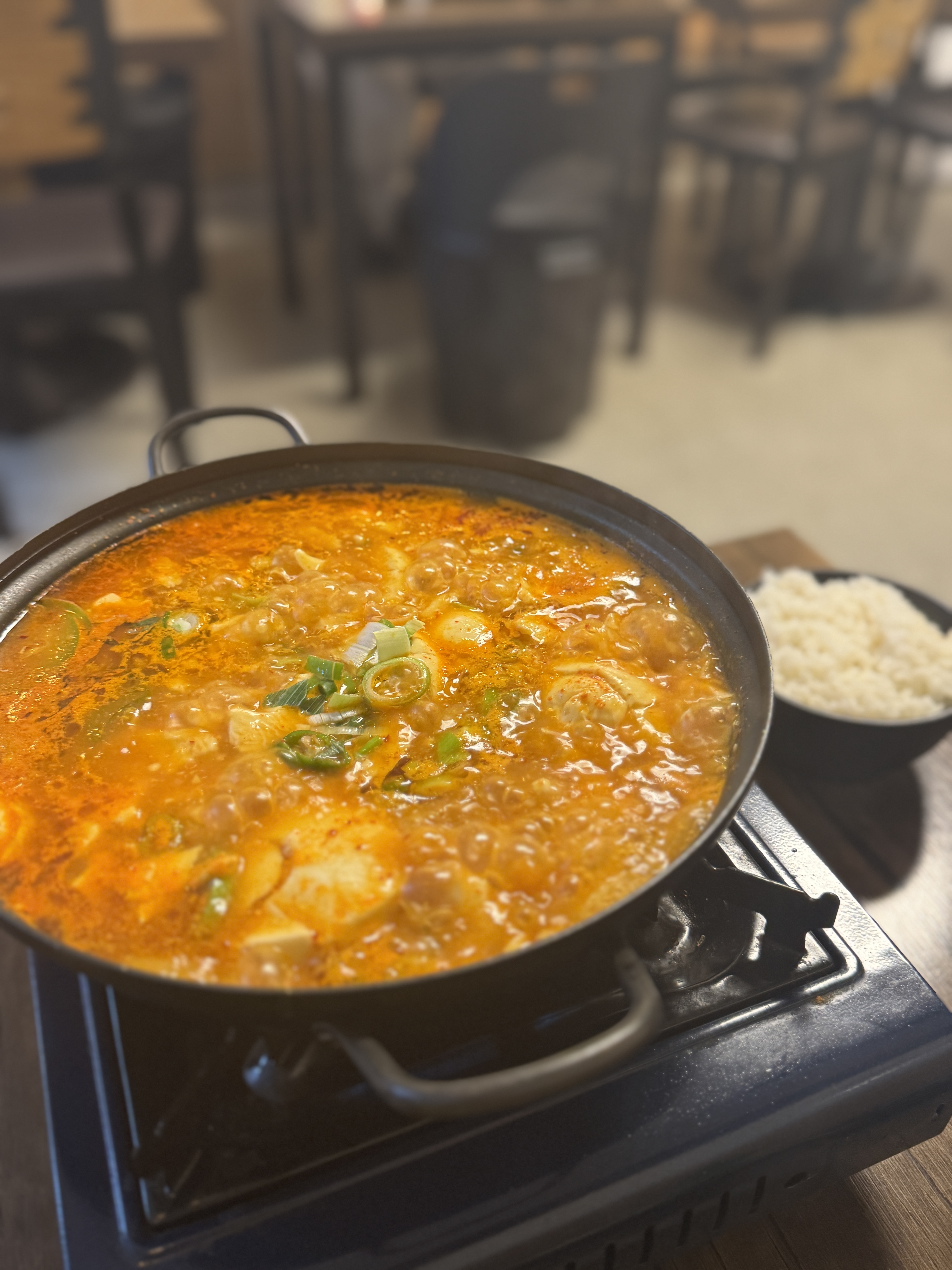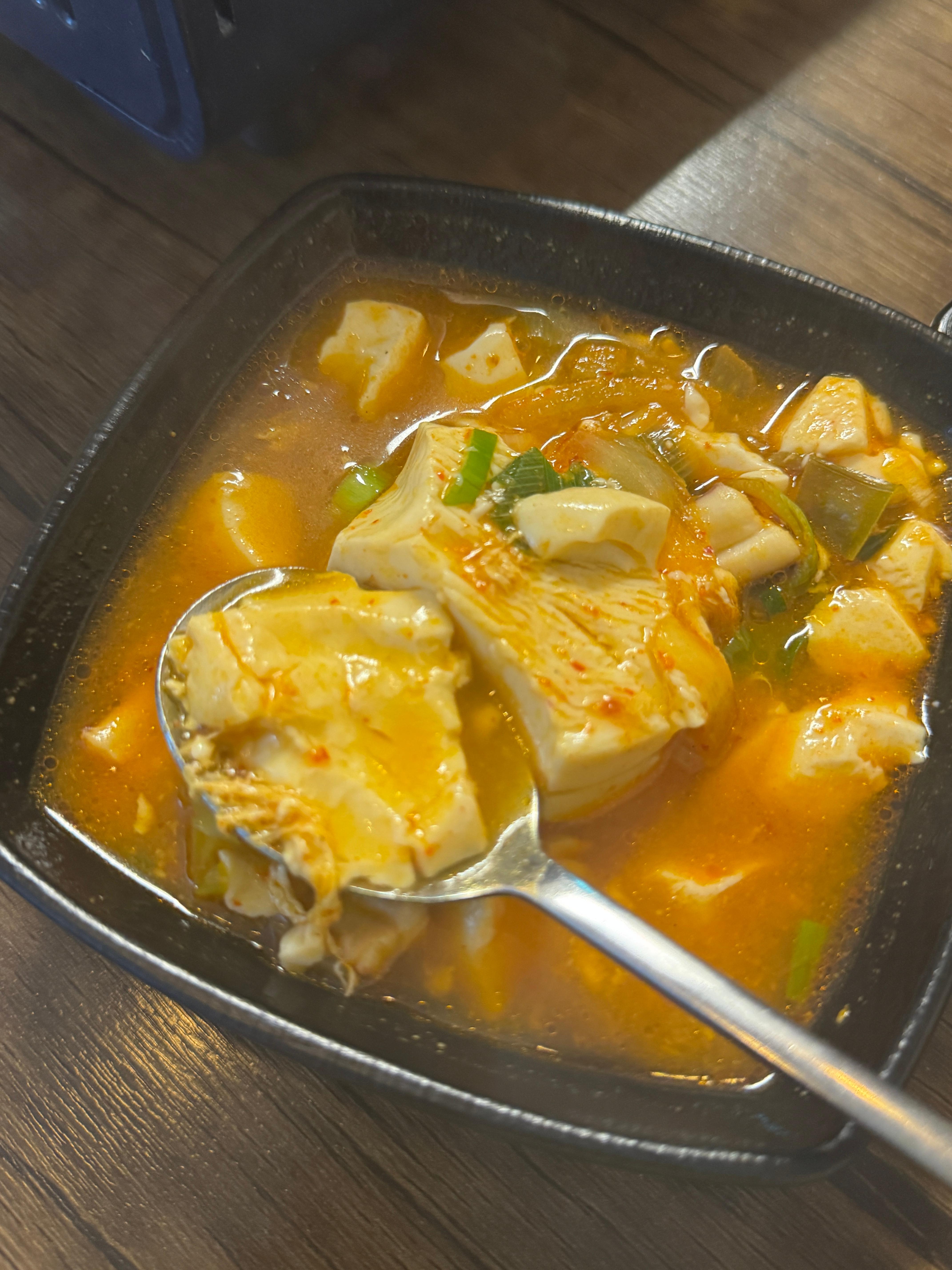 커다란 냄비째로 보글보글 끓으며 나왔는데, 국물은 얼큰해 보이지만 막상 먹으면 칼칼하면서도 시원하다. 잘 풀어진 순두부가 숟가락마다 푹푹 떠져 나오고, 국물은 속을 확 풀어주는 맛. 여기에 밥을 말아 먹으니 국밥 같기도 하고, 소주 한 잔 곁들이면 해장국 같은 매력도 있었다.