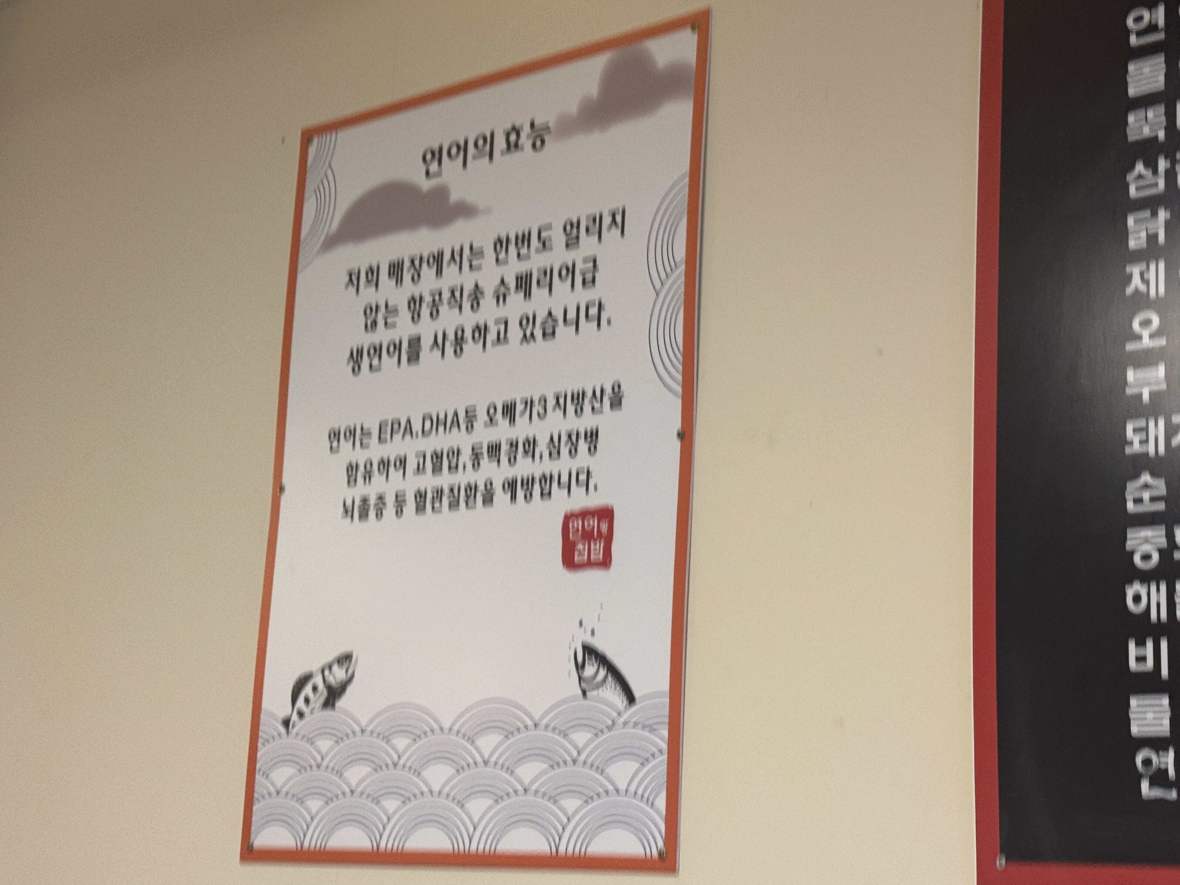 벽면에는 ‘연어의 효능’이 적힌 안내판이 붙어 있었는데, 오메가3와 DHA가 풍부해 혈관 건강과 두뇌 발달에 좋다는 내용. “우리는 신선한 연어를 쓴다”라는 자신감이 느껴졌다. 메뉴판에는 연어초밥, 연어덮밥 같은 익숙한 연어요리와 함께 김치찌개, 순두부찌개 같은 친근한 집밥 메뉴가 함께 적혀 있었다.