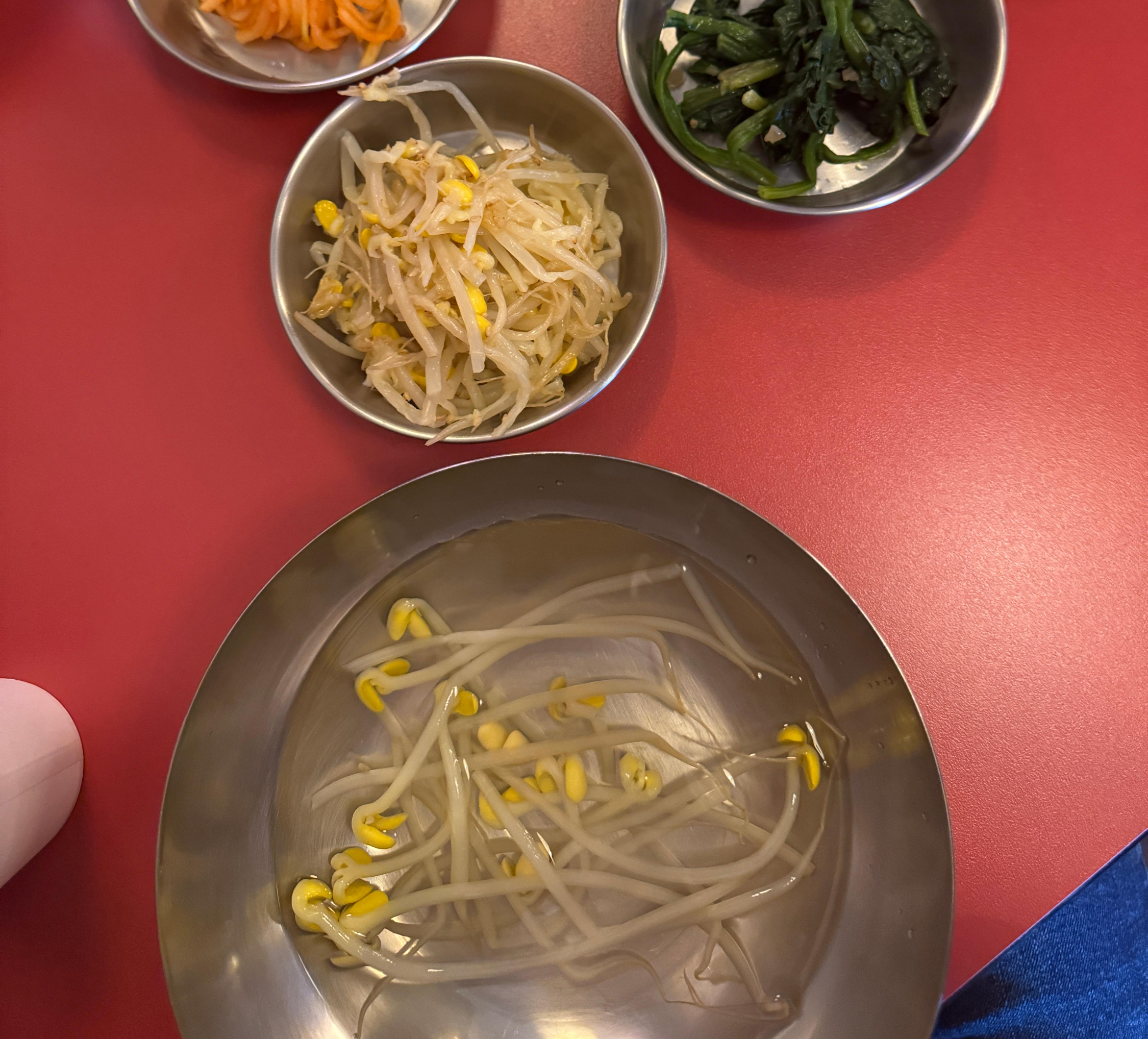기본 반찬으로는 콩나물국, 무생채, 시금치, 마늘, 고추장, 깻잎이 제공되며 국은 스테인리스 대접에 담겨 나왔다.